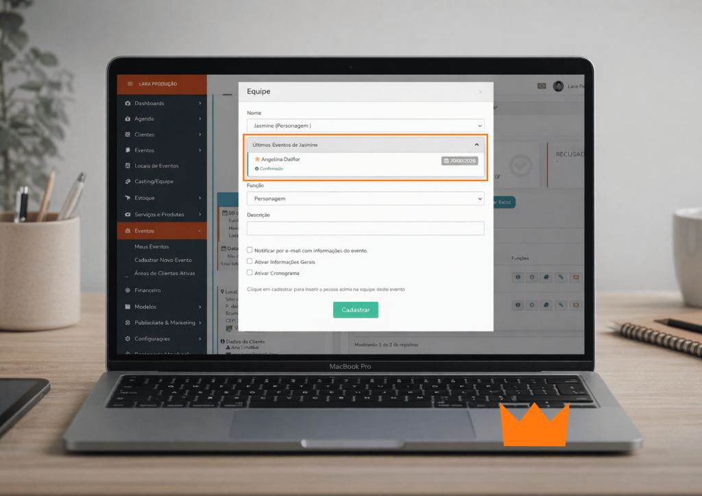 Essa funcionalidade permite que você revise a escala de equipe para eventos antes mesmo de confirmar o serviço, evitando o estresse de descobrir uma falta apenas no dia da montagem. É a segurança que sua empresa de eventos precisa.